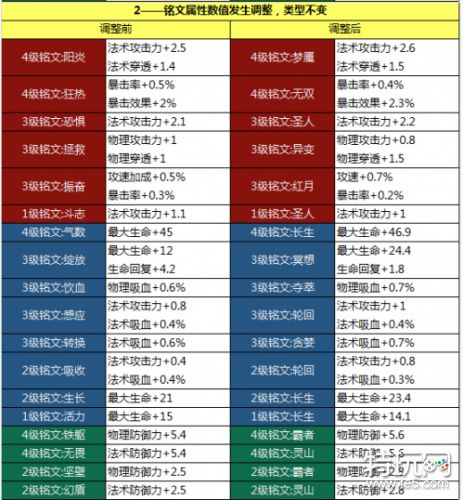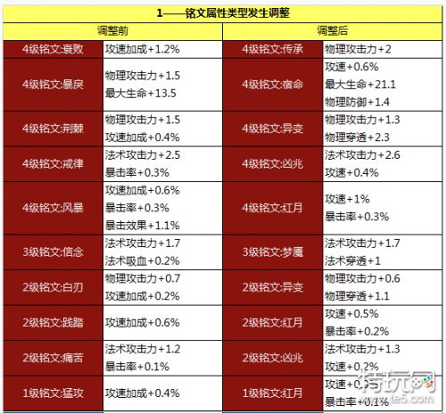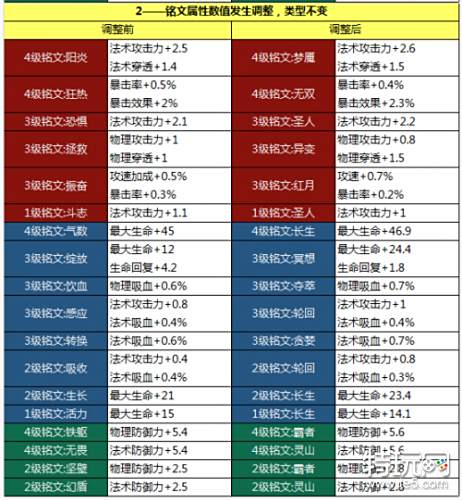 调整前后1-4级铭文命名及属性对应关系如下表所示: