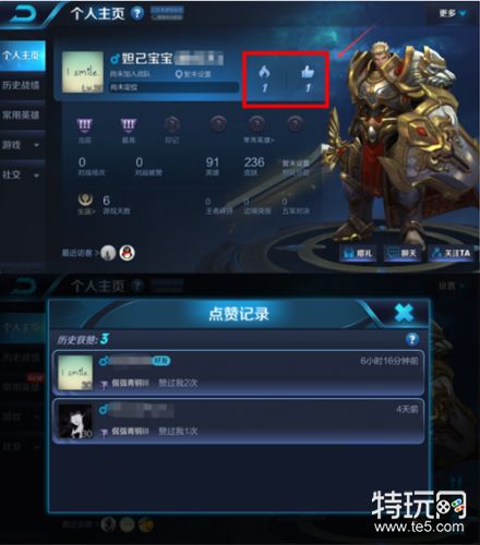 访问其他玩家主页时我们可以点击个人主页点赞按钮对玩家进行点赞,该玩家可以在点赞记录中看到。
