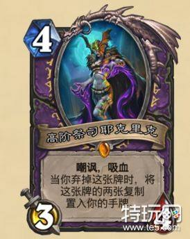 4费3-4嘲讽+吸血的身材可以说还是很不错的,另外当这张牌被弃掉的时候,会将两张相同的牌到你的手中,可以配合术士的任务,不但能够做任务,还能很好的补充手牌。就算不玩弃牌术,这张配合夺尸者也能发挥出不错的效果。(奇利亚斯+这张牌双保险)