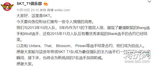 SKT转会大地震:Bang和Wolf成自由人,SKT官宣转会消息,包括Bang和Wolf在内的选手合同到期离队,人员变动可以说是十分之大。