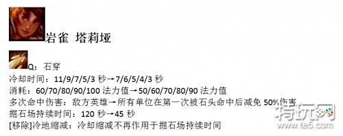 解析:岩雀再度挨刀,8.23版本的岩雀主要被削弱了清野能力,之前Q技能的伤害减少效果只对英雄有效,削弱后的Q技能对野怪一样会出现伤害减少,这就让岩雀的清线能力以及清野能力有了较大幅度的削弱,岩雀不再是那个可以快速清野的英雄了,虽然补偿了冷却时间、掘石场时间的缩短,但这都不能弥补伤害降低所带来的影响,岩雀现在在峡谷几乎无法立足,中单不好打,野区也要被赶出去了。