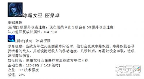 解析:首先我们就来看看8.23的小重做项目,丽桑卓的被动重做。被动技能改成了冰裔征服,无论丽桑卓是否接触到了敌人,只要敌人死在了丽桑卓附近,就会变成一具寒尸,四秒后发生爆炸,造成额外伤害并减速敌人,满级520的伤害,并且具有0.3的AP的AP加成。虽然这个技能在对线期几乎无法触发,触发了效果也没有多大用处,但在团战中,这个被动都会给敌人带来巨大的麻烦,敌人不仅要注意丽桑卓的技能,还需要注意自己的队友是否变成了冰尸,变成了冰尸就还得远离,一来二去,丽桑卓对敌人阵型的威胁就更大了。