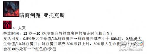 解析:原定于8.22版本的改动被放到了8.23版本中,R技能的持续时间缩短到了10秒,不过在鲜血魔井达到80%时,大招复活就会触发最大值回血,这一点还是很不错的。