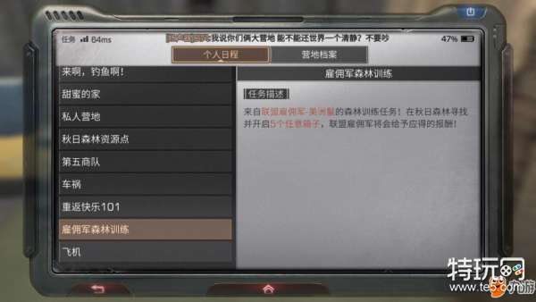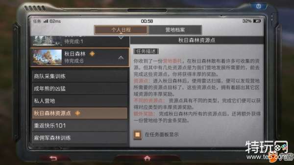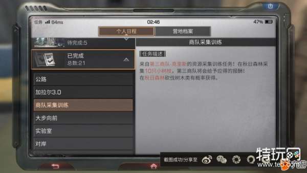 相应的,采集任务不仅可以在秋日森林的悬赏任务里获得,乘坐直升机返回家中以后再从家坐直升机前往101营地,在101营地找到商会,商会的瑞秋旁边有一个任务公告栏,在上面也可以领到采集任务,比如第五商队任务,通过其中的采集任务也可以领取到相应的奖励。