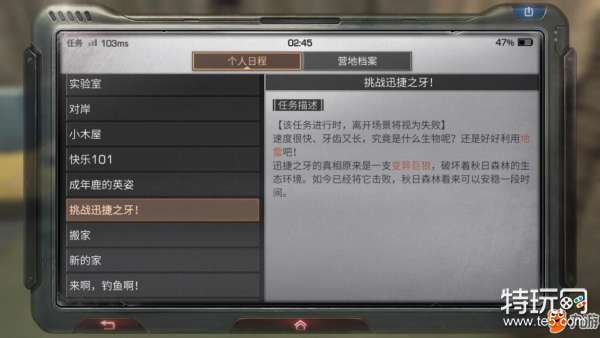 不仅如此,在地图里的非游戏角色身上,我们还可以领取到一些特殊的战斗任务,比如用地雷打败一只凶狠的狼:迅捷之牙。击败迅捷之牙需要注意的是我们绝不可用手中的武器与它硬拼,因为硬拼是拼不过迅捷之牙的,它是一种很凶狠的生物,我们需要提前埋好大量的地雷,然后引诱迅捷之牙踩到地雷,这样可以给迅捷之牙带来最大的伤害。