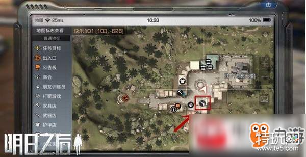 2、打开地图找到武器店的位置,前往武器店,武器店在朋友训练师旁边。