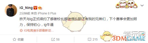 昨天与ig正式续约了感谢校长感谢俱乐部还有我的兄弟们,下个赛季会更加努力,保持初心,ig牛逼