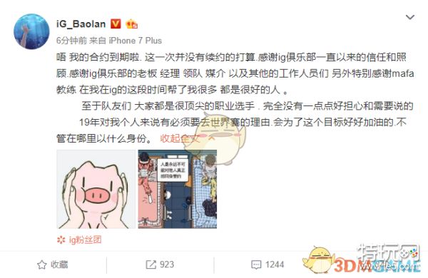 今天,冠军战队IG的辅助选手Baolan通过个人微博发布消息,与IG战队的合约正式到期,并且没有续约打算。