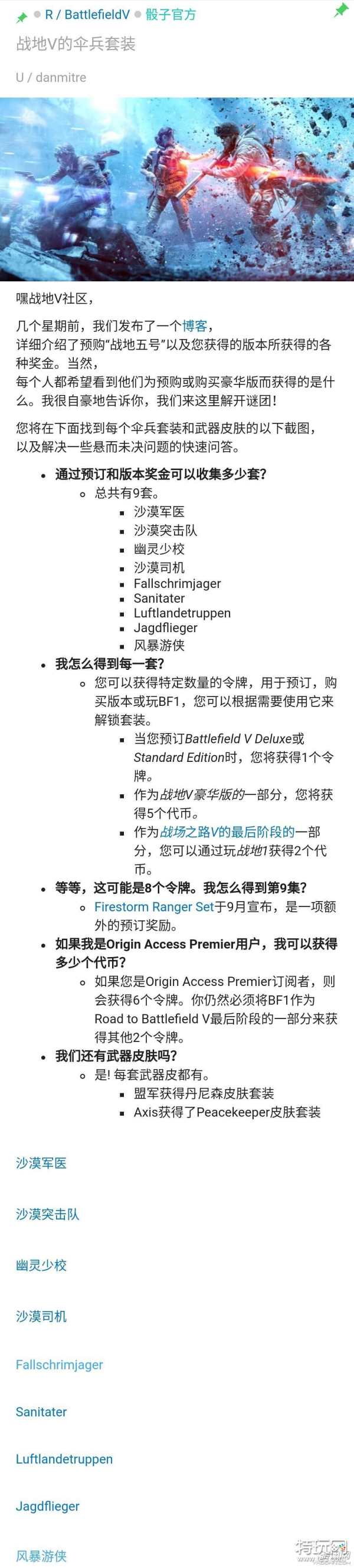 《战地5》本作中玩家通过预购等活动共可获得九套伞兵套装,分别是怎样的呢?相信很多玩家都想知道,下面就为大家带来战地5全九套伞兵套装获得方法及外观预览,一起来看看。