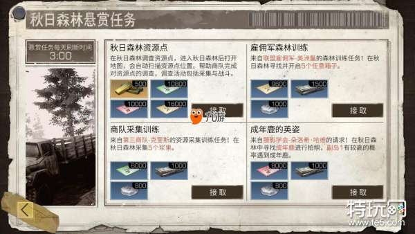 每天可以接取四个任务,收集资源点,森林训练,采集巡逻以及猎鹿。