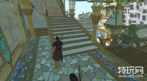 就在传送点“大门”那一层,中间大道往下走一点,右侧的房屋里有楼道一路往上,如图(右上小地图)所示附近