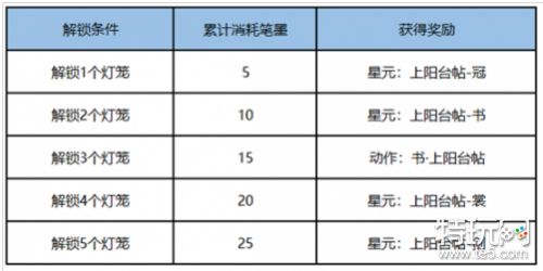 完成任务可得笔墨,每5个笔墨解锁1个灯笼!解锁灯笼可以获得李白《上阳台帖》星元皮肤奖励和李白《书·上阳台帖》动作包奖励!
