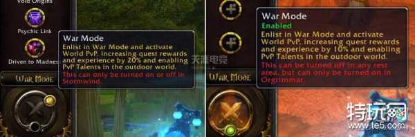 玩家现在可以在任意休息区域关闭战争模式,但是要开启战争模式仍需前往暴风城/奥格瑞玛才可以开启。这是战争模式在8.1复仇之潮版本中的第二次修改,会将两方阵营中弱势的一方(目前是联盟)的战争模式加成提高至30%。