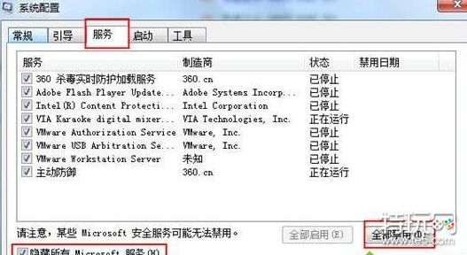 在系统配置中,点击“服务”选项,勾选左下方“隐藏所有Microsoft服务(H)”前方的框框,接着点击“全部禁用”,最后点击“应用”,如下图所示: