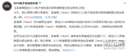 在双方经过多次沟通及协商后,李官炯(Heart)接受俱乐部邀请正式加盟EDG,担任EDG英雄联盟分部主教练一职。我们相信,EDG英雄联盟分部教练组在李官炯(Heart)的带领下,将在战术创新、赛训管理等方面带来全新改变。同时也期待在2019赛季,李官炯(Heart)能够带领EDG英雄联盟分部突破自我,再创辉煌。