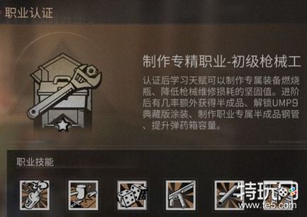 枪械工是专精制作枪械的职业,可以制作燃烧瓶、降低枪械维修损耗的坚固值,进阶后有几率额外获得半成品、解锁UMP9典藏版涂装、制作职业专属半成品钢管、提升弹药箱容量。