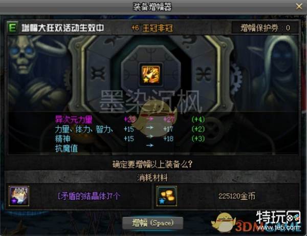 这里有两点大家一定要注意,这次增幅活动策划实际上玩了一个文字游戏,增幅6之前虽然确实不会掉级,但是会失败!!!增幅8之前虽然不会归零,但是会降级!!!这简直是个大坑,所以那些想要上个6或者上个8就收手的勇士们还是得且行且珍惜。