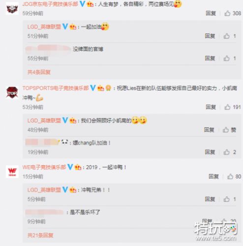 选手原战队纷纷在下方回复加油。