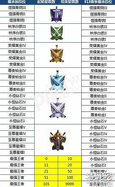 这张是s13的段位继承表,相较于s12,只有在高段位有些微变动,一般是掉一级,低段位不会有变动,预计s14也是这样。