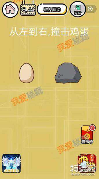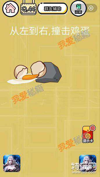 智力达人第44关图片中有一块石头还有一个鸡蛋,让我们撞击鸡蛋,但是要按照从左到右的顺序,石头在右边,鸡蛋在左边,这个要如何进行操作呢?还没有通关的小伙伴们就来看小编的正确操作吧!
