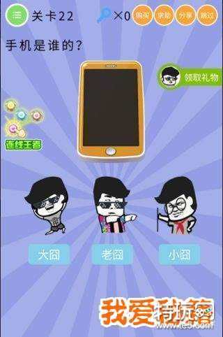 手机是谁的?是微信小游戏智商大爆炸22关问题,给出的是三个选项,分别是老囧,大囧,还有小囧,直接看的话,是很难分辨的,现在我们的手机一般都是指纹解锁,顺着这个思路走起来。 智商大爆炸22关攻略 问题: 手机是谁的? 正确答案: 按住手机home键。 【攻略推荐】 开心脑力挑战1-60关答案大全