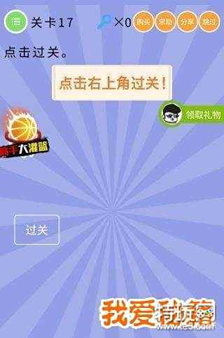 “点击过关”是微信小游戏智商大爆炸17关问题。下面还有一行提示:“点击右上角过关”,可是呢,右上角好像是没有过关的选项的,下面我爱秘籍小编给大家分享答案是什么?