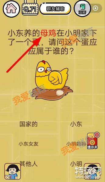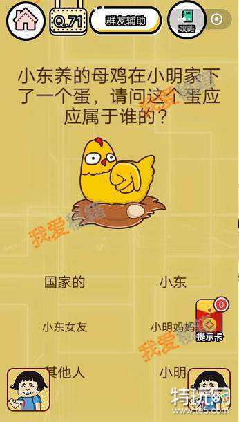 智力达人第71关有一只母鸡,下了一个鸡蛋,这只母鸡是小东家的,那么这只蛋应该属于谁的呢?属于小明还是小东呢?感兴趣的小伙伴们就来看详细攻略介绍吧!