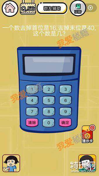智力达人第56关图片中有一个计算器,需要玩家们按照输入正确数字,这个数字去掉首位是16,去掉末位是40,这个数字是多少呢?还没有完成通关的小伙伴们就来看正确答案吧!