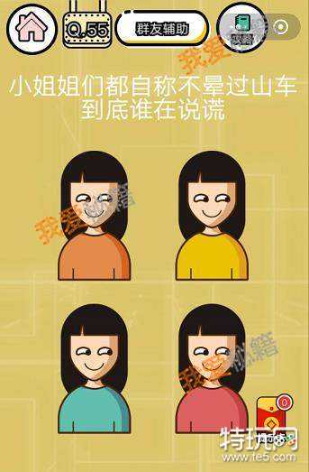 第55关中有4个小姐姐,他们都说不晕过山车,那位小姐姐在说谎呢?你们找到说谎的那位小姐姐了吗?你们是不是还卡在这个关卡呢?还没有完成通关的小伙伴们就来看正确答案吧!