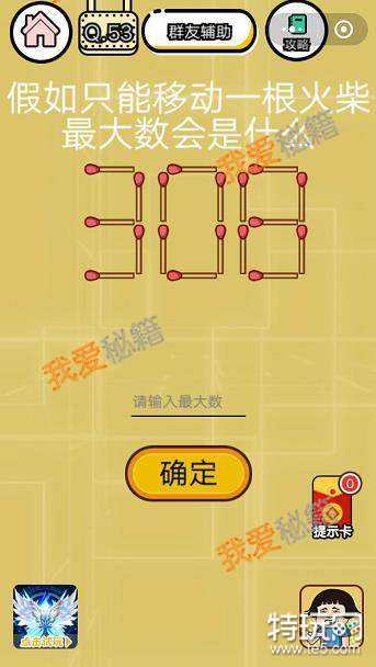 智力达人第53关图片中有几个火柴棒组成的数字,这个数字是308,题目的要求是让我们移动一根火柴变成最大的数字,移动哪一根呢?小编为大家带来了正确操作方法。
