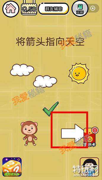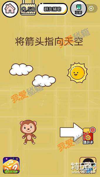 智力达人第50关图片中有两朵白云、一个太阳、一只小猴子还有一个白色的箭头,要求我们将箭头指向天空,但是不少玩家反映称箭头不能移动啊,怎么才能指向天空呢?正确通关方法速来围观!