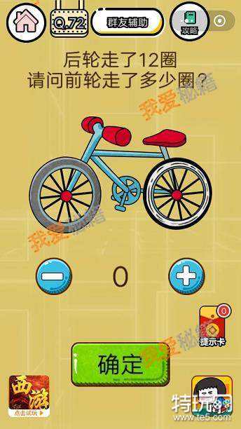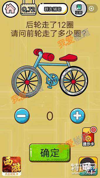 第72关图片中一辆自行车,自行车的内部结构你们了解吗?后轮走了12圈,请问前轮走了多少圈?所有的答案都输入了但是就是不正确,为什么不是12圈呢?正确通关攻略分享给大家!