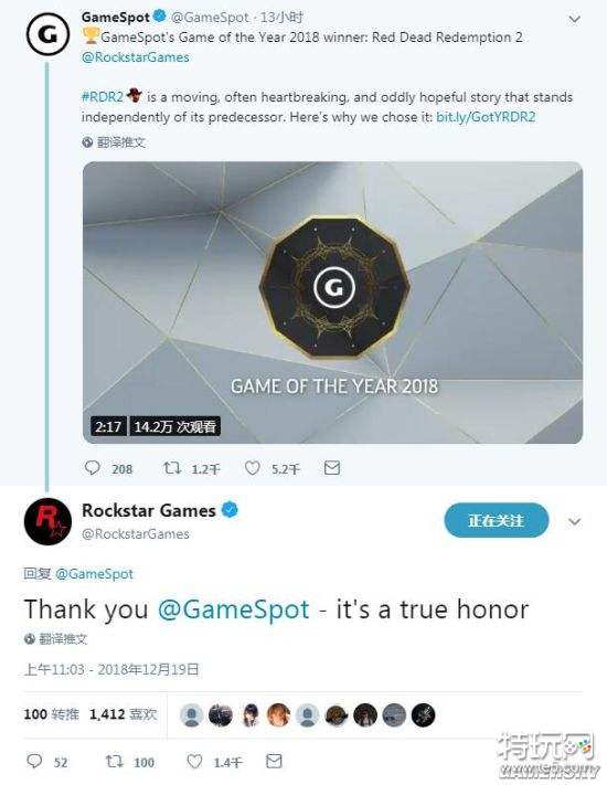 GameSpot公布了他们的年度最佳游戏评选,而获得年度最佳游戏的正是《荒野大镖客:救赎2》,而对此,R星也在推特上进行了转发并留言致谢:“谢谢你们,GameSpot,真的很荣幸。”