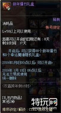 dnf新年爆竹礼盒在2019年1月1日0点之后,才可以开启。1月10日之后将删除。