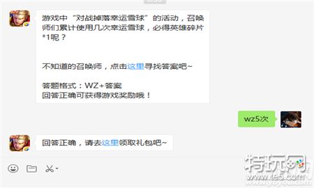 游戏中“对战掉落幸运雪球”的活动,召唤师们累计使用几次幸运雪球,必得英雄碎片*1呢?(答题格式:WZ+答案)