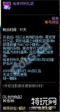 活动期间,每天可以领取一次[期盼惊喜礼盒],开启礼盒后获得的[哈林材料礼袋]可在2019年1月21日维护后开启