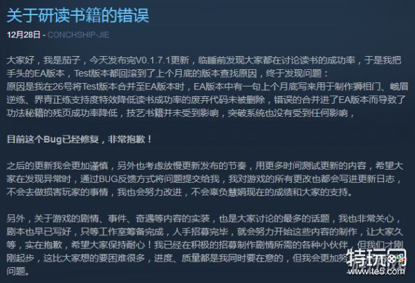 花了两个小时,把手头的EA版本,Test版本都回滚到了上个月底的版本,终于发现问题,原因是将Test版本合并至EA版本时,EA版本中有一句上个月底写来用于制作狮相门、峨眉逆练、界青正练支持度特效降低读书成功率的代码被错误的合并进了EA版本而导致了功法秘籍的残页成功率降低,技艺书籍并未受到影响,突破系统也没有受到任何影响,目前这个Bug已经修复,非常抱歉!