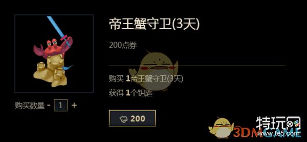 200点券购买一个帝王蟹守卫,同时获赠一个钥匙。一个钥匙就可以开启一次幸运珍宝盒。也就是2元可以开启1次幸运珍宝盒。