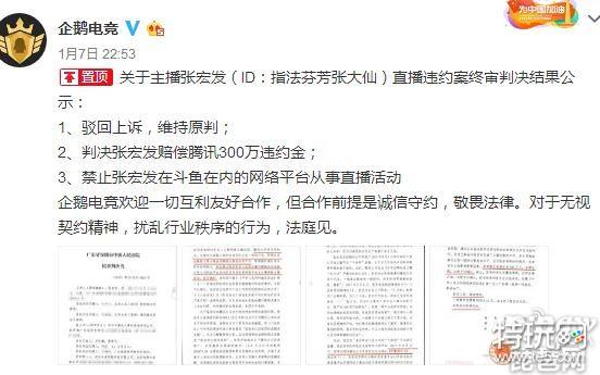 至于今天的赔偿事件,其实早在张大仙跳槽到斗鱼时,腾讯就已经发出过违约声明,将张大仙告上法庭,这件违约案今天才判下来,由于张大仙在合约期内单方面跳槽到其他平台,所以配判决罚款3百万给腾讯,并且腾讯也宣布全面封杀张大仙,被腾讯封杀基本上可以说是要凉了。