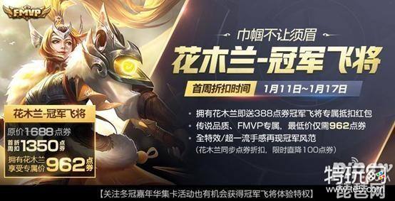 花木兰冠军飞将的售价是1688点券,首周折扣价是1350点券,如果玩家拥有花木兰的话,只要962点券,所以如果拥有花木兰的话,这款皮肤还是非常实惠的,可以说这是最便宜的传说皮肤!