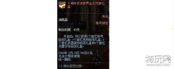 DNF的十周年史诗跨界金石兑换礼盒包含1个追忆称号自选礼盒,一个追忆宠物自选礼盒,一个追忆武器装扮自选礼盒,一个追忆伤害字体自选礼盒,包含了十周年内发布的各种绝版的道具与物品,值得拥有。