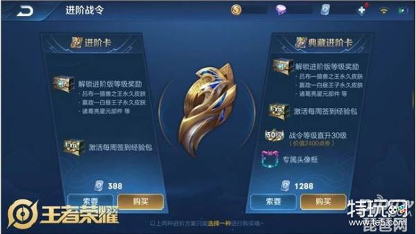 目前进阶战令的价格有两种,分别是388点券和1288点券。