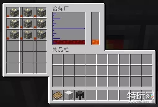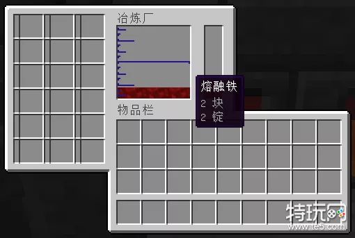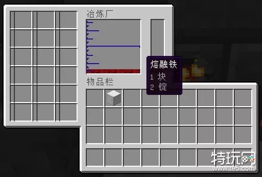 此时从炉子上爬下来,打开冶炼炉控制器就可以在界面左侧看到正在烧炼的铁矿了,每个方块左边的进度条代表了烧炼进度。烧炼完成后就可以在界面中间看到熔融金属了。