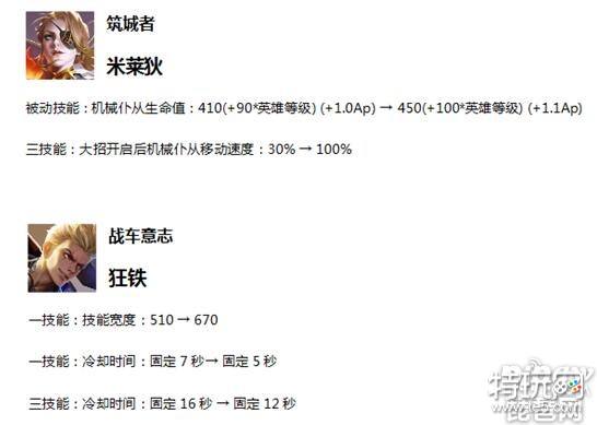 狂铁在本次调整中也加强了不少,其中加大了一技能的释放范围,并且冷却时间从7秒改成5秒,三技能则从16秒变为12秒。