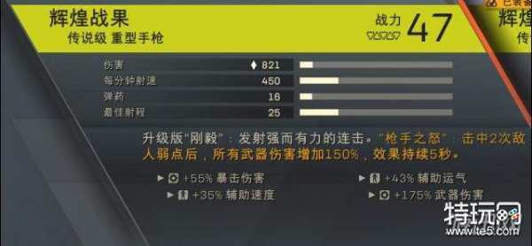 刨除这些烦人的点,其实圣歌的词条系统是很简单的,对象类别繁多,单位也多,但其实玩儿家最在乎的,无非就是主武器/技能的伤害/CD了。目前观察发现,大数字词条一般为单独限定的齿轮词条,所以一个好的大数字齿轮伤害类的词条就是主词条,没这个的东西容易比较废。比如我这把手枪,个人认为词条就相当不错,两个大数主词条,附词条也不废,数额也不小。(宗1炮塔,5秒7枪下一位。)