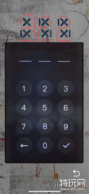 这个密码看似摸不到头脑,其实是需要你去补齐没有画出来的线,写出来是类似计算器的数字,图中红笔描出密码为922