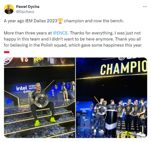 dycha就此事在个人平台做出回应:“一年前,2023 IEM达拉斯冠军,现在是替补席成员。在ENCE效力三年多,感谢一切,现在我在这支队伍中并不开心,我不想再待在这里了。感谢大家对波兰队的信任,这让我在这一年收获了一些快乐。”
