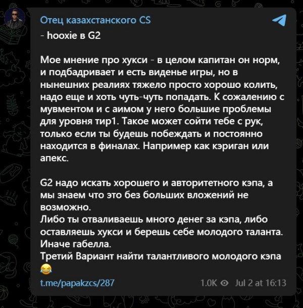 “我对HooXi的看法——他是位合格的指挥,对比赛有自己的看法。但在当前的情况下,你还需要打出不错的个人数据。遗憾的是他在走位和瞄准上难以应对T1赛场。只有当你夺冠且不断打进决赛,就像Finn Andersen | karrigan和Dan Madesclaire | apEX时才能够摆脱这种状况。