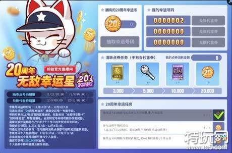 玩家可以通过消耗20周年幸运币抽取全区唯一专属号码,号码可以参与12月8日周年庆福利直播夜抽奖,奖励包括“全超特变更卡全家福”、“超特角色包”等百万豪礼。12月9日起玩家还可以参与个人抽奖,领取最高200万代金券奖励。