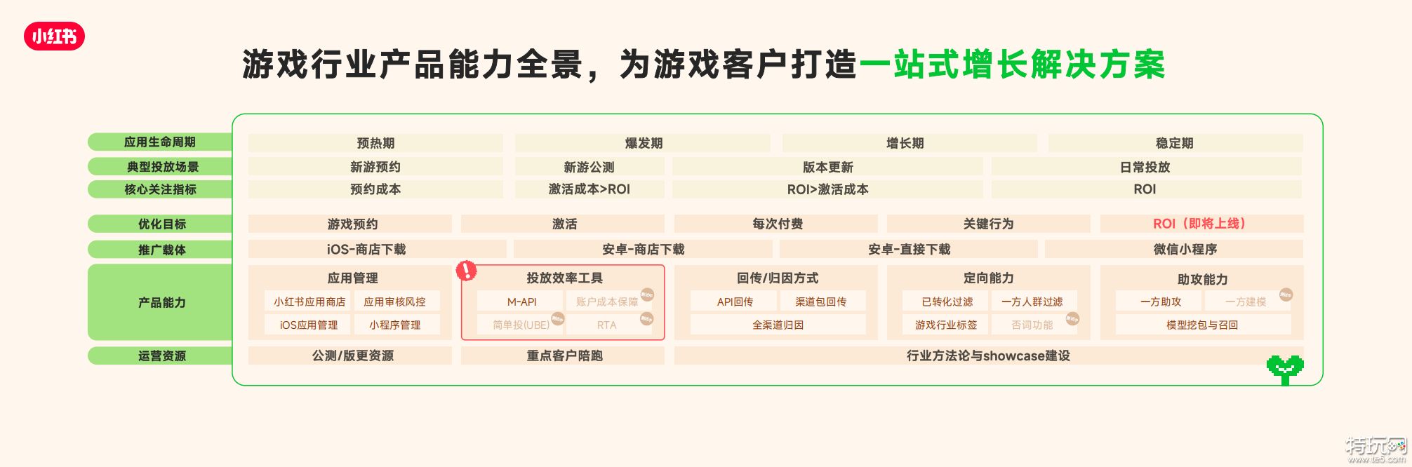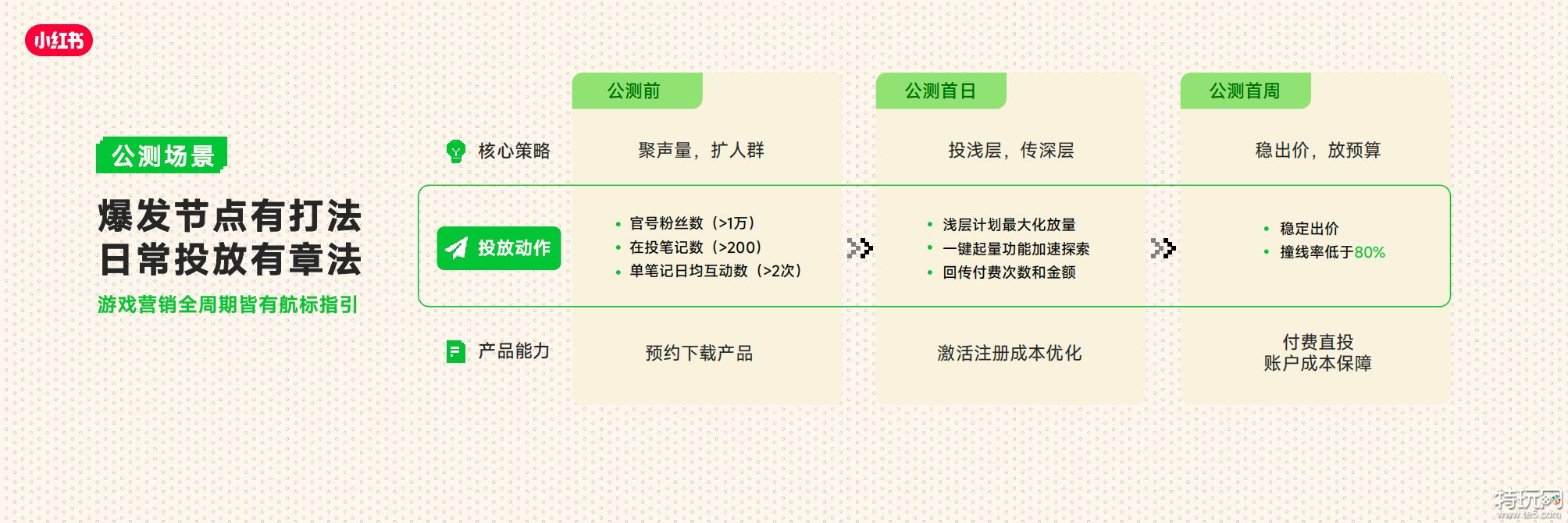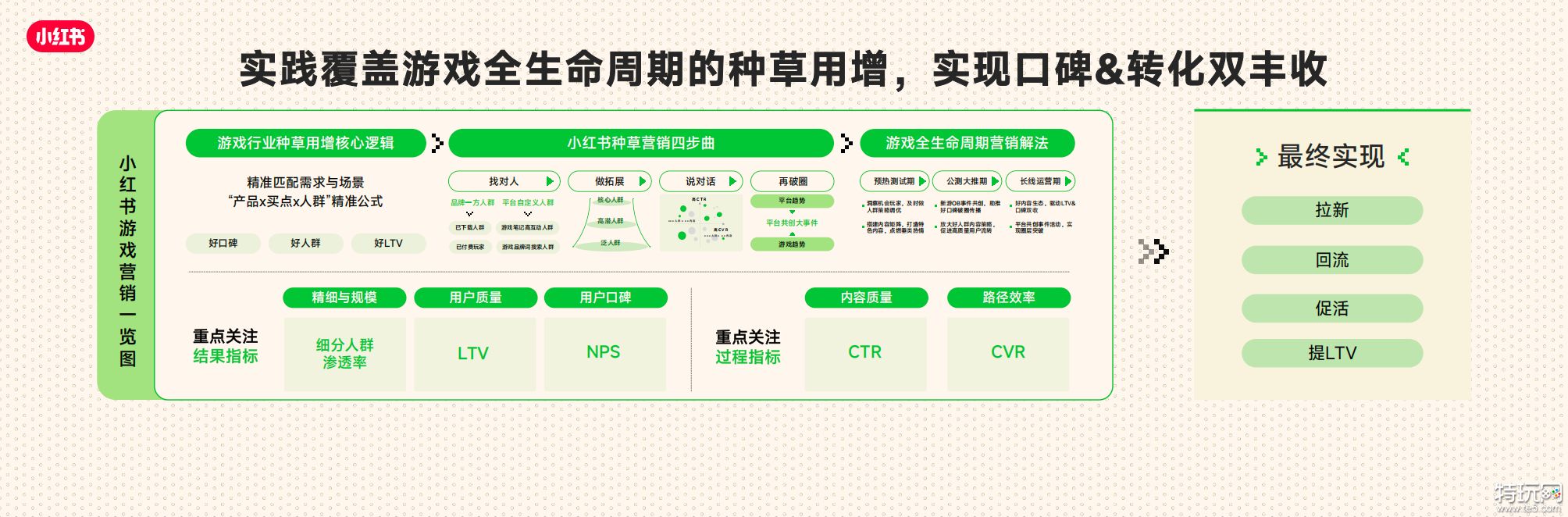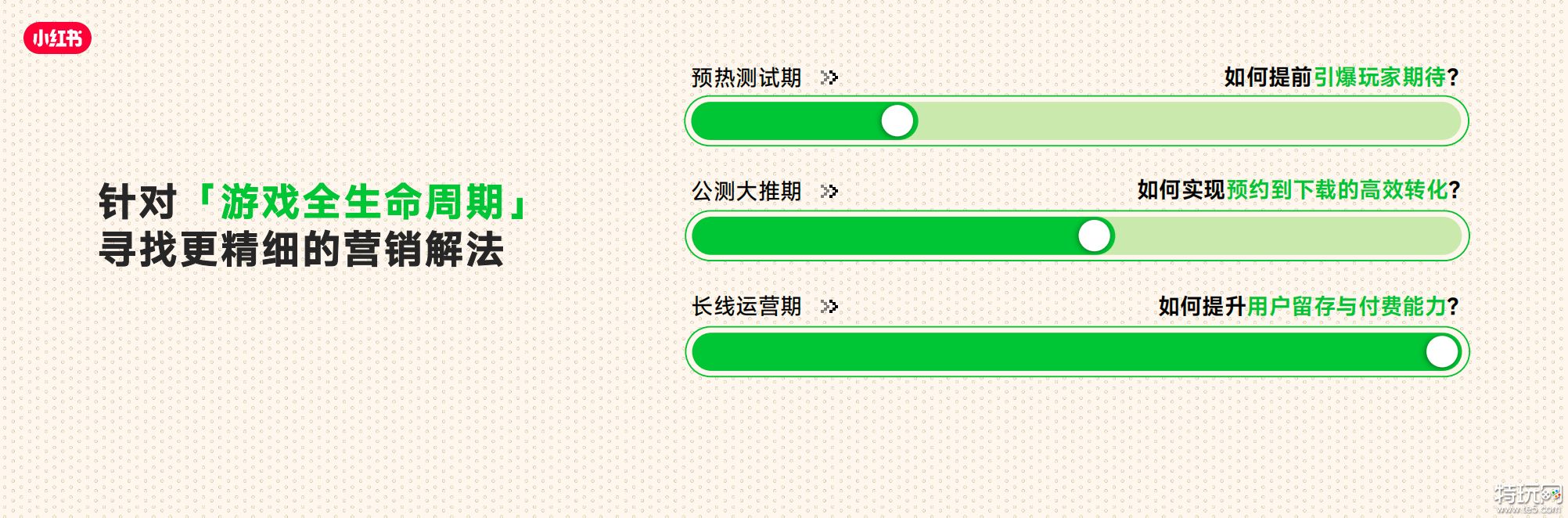 • 同时我们也针对游戏全生命周期(覆盖预热测试期、公测大推期、长线运营期),提供了精细化的营销解法。让增长不再是单点爆发的博弈,而是成为可孵化可经营的长久生意,打造小红书成为覆盖游戏全生命周期的高价值用户运营阵地。